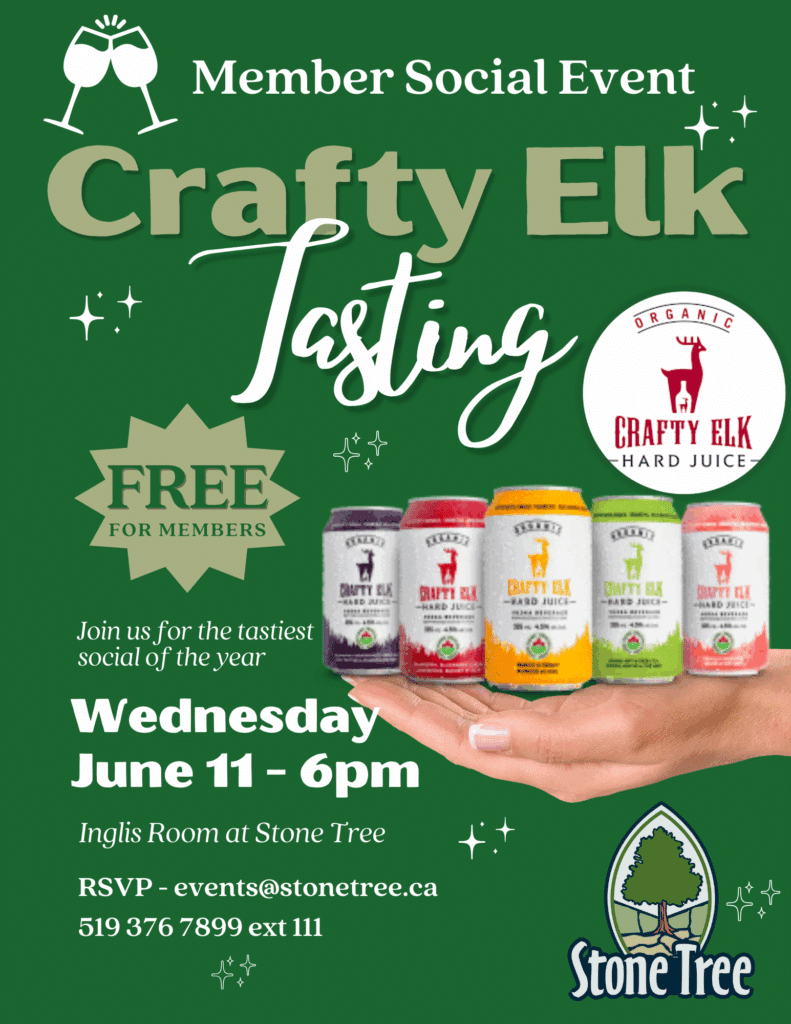 Join us for a fun and flavourful evening at Stone Tree’s Member Social Event, featuring a tasting of Crafty Elk Organic Hard Juice — a refreshing, premium beverage crafted with organic ingredients and natural fruit flavours.