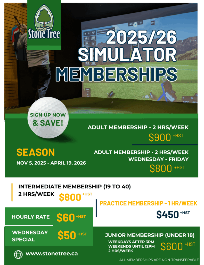 GOLF SIMULATOR Adult Membership$900 + HST 2HRS/WEEKAdult Membership – Wed to Fri$800 + HST 2HRS/WEEKIntermediate Membership (19 to 40)$800 + HST 2HRS/WEEKPractice Membership$450 + HST 1HR/WEEKJunior Membership (Under 18)Weekdays after 3pm,Weekends till 12pm$600 + HST 2HRS/WEEK Member Bonuses Simulator Members save $35/month on fitness memberships. Get 25% off on all food and beverage during special events (non-golf related).